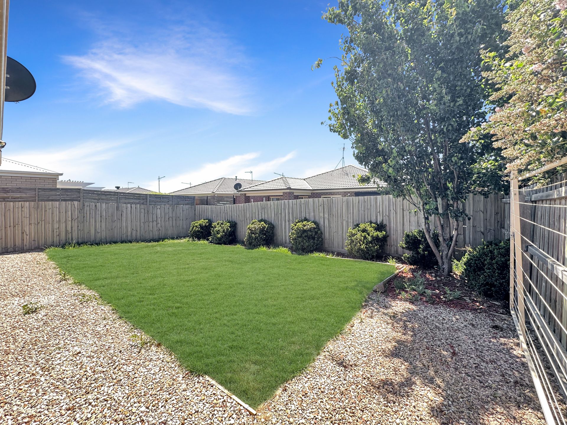 The secure, low-maintenance backyard features lush lawn and garden beds, offering plenty of room for kids to play. With minimal upkeep required, you can simply enjoy the outdoors without the hard work.