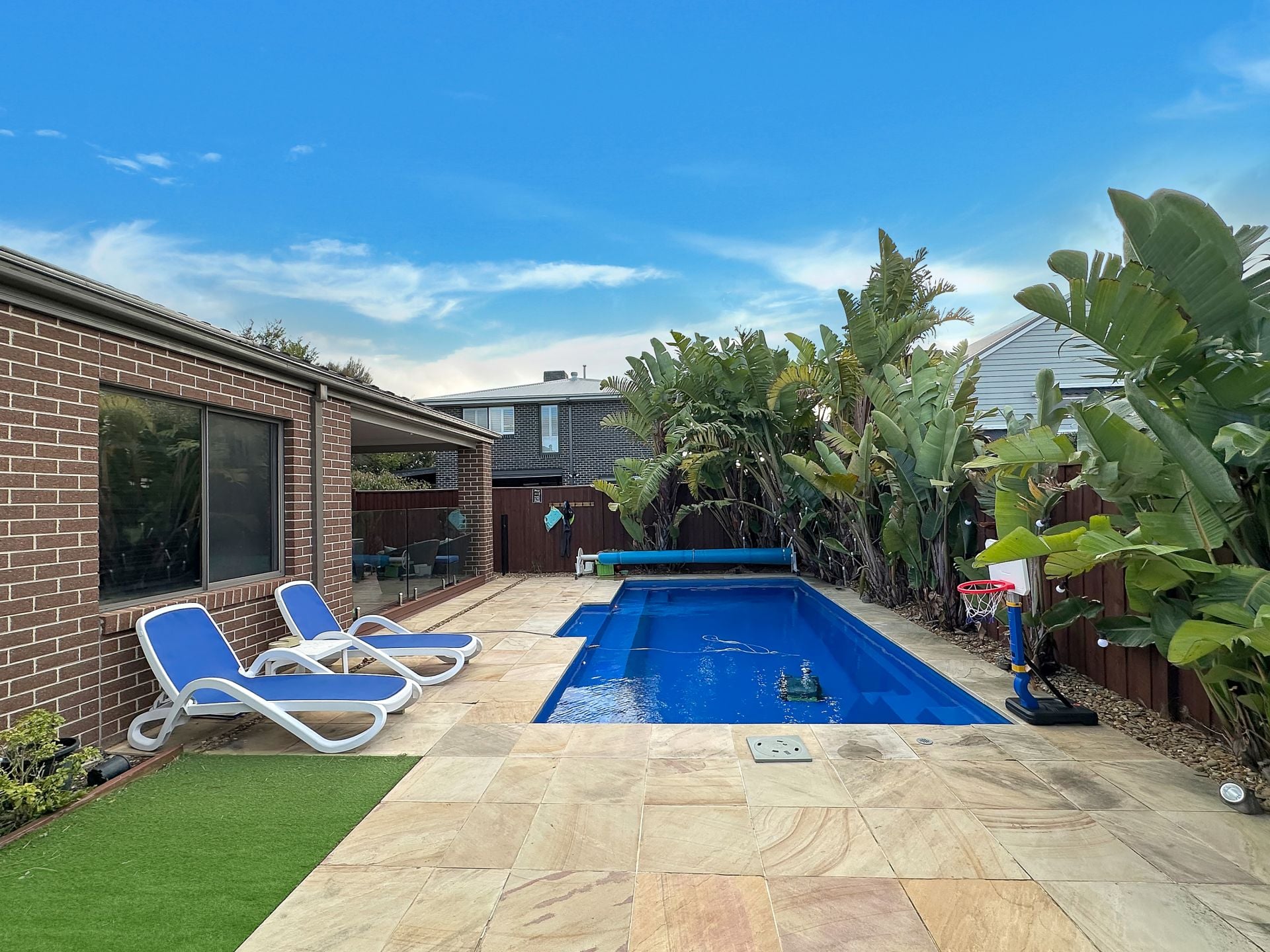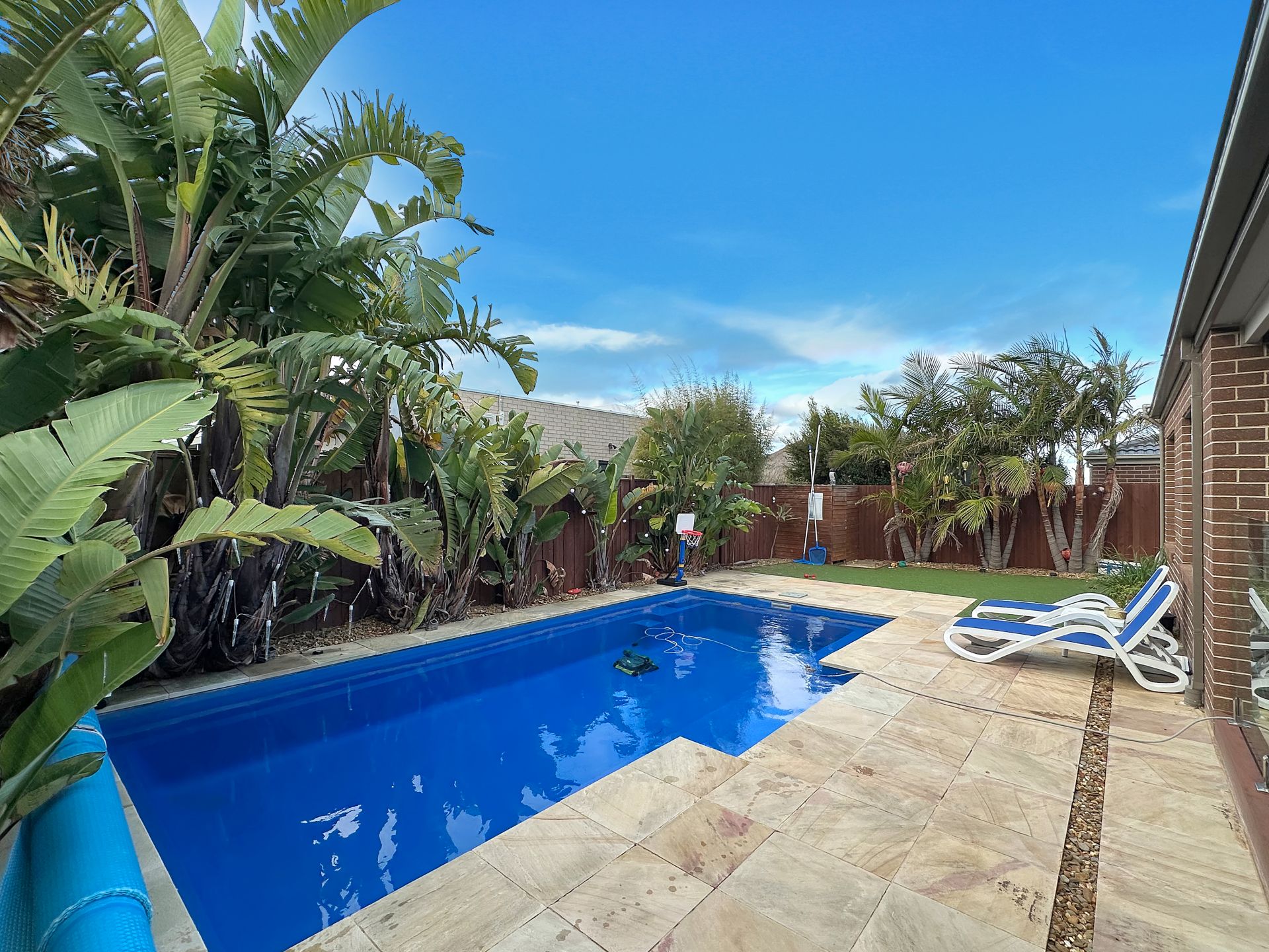 Enjoying the serene outlook over a sparkling 8x4m heated in-ground pool, framed by tropical landscaping—visible from the heart of the home. Every day feels like a retreat.
