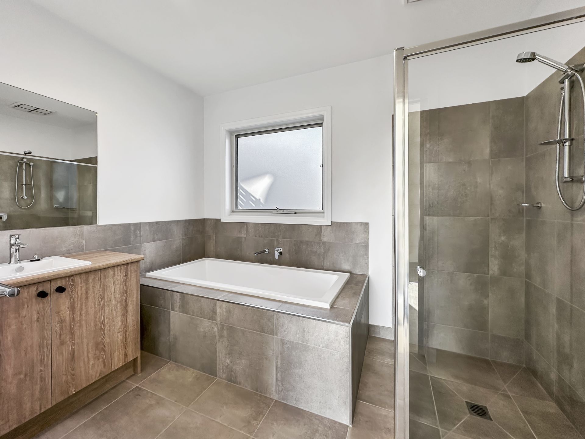 The home boasts two sleek, contemporary bathrooms, including a private ensuite with a bath. High-quality fittings, clean lines, and neutral tones create a fresh, timeless feel that suits any style.