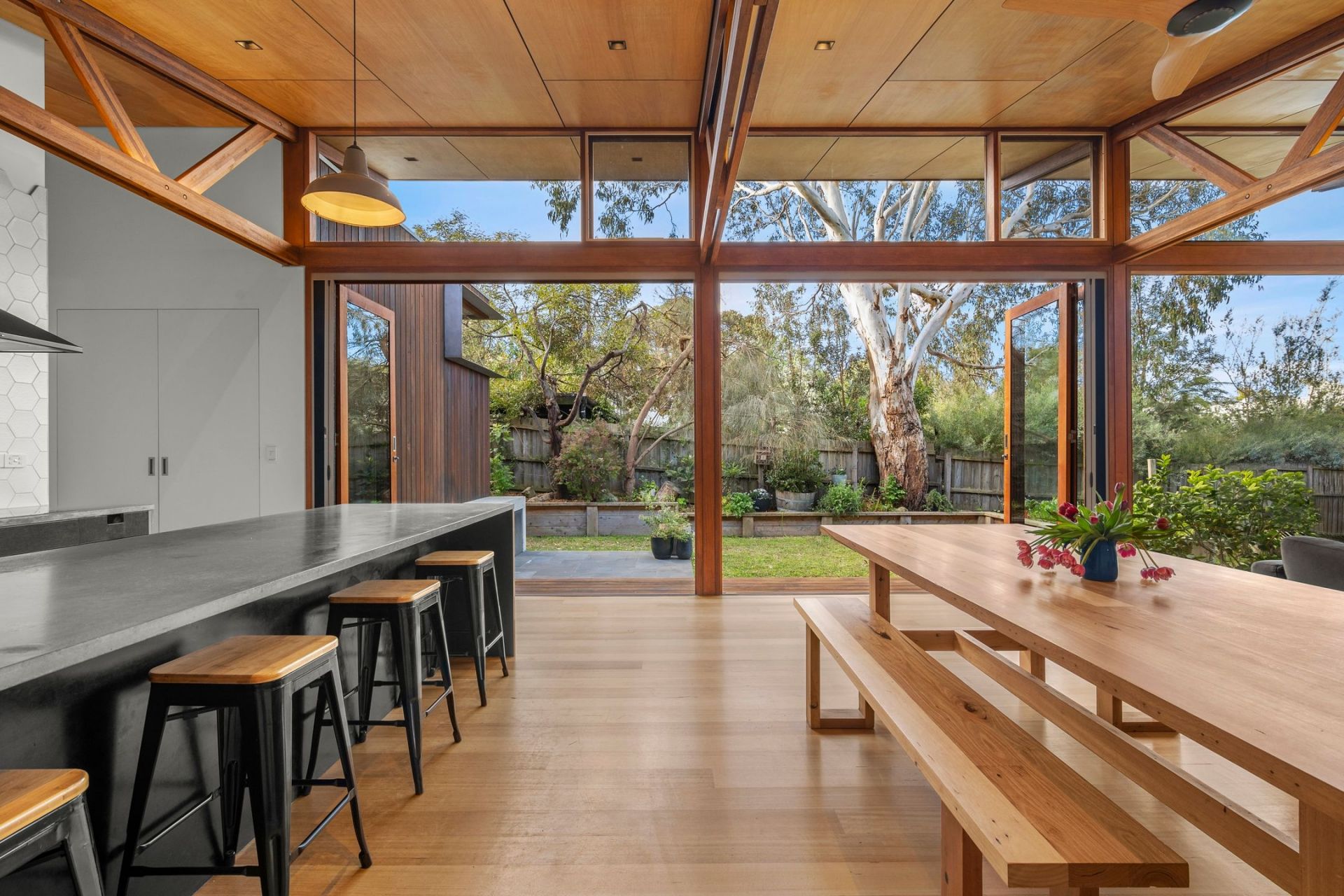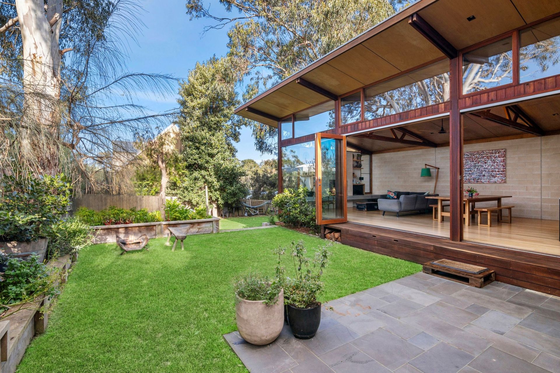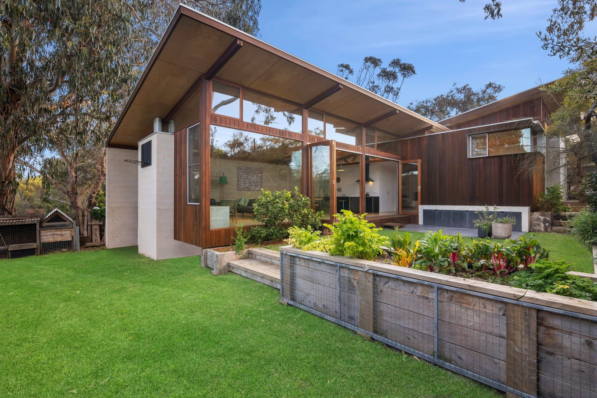 • An idyllic backyard with beautifully established native gardens, an outdoor entertaining area, veggie patch, a chicken coop & a heated outdoor shower!