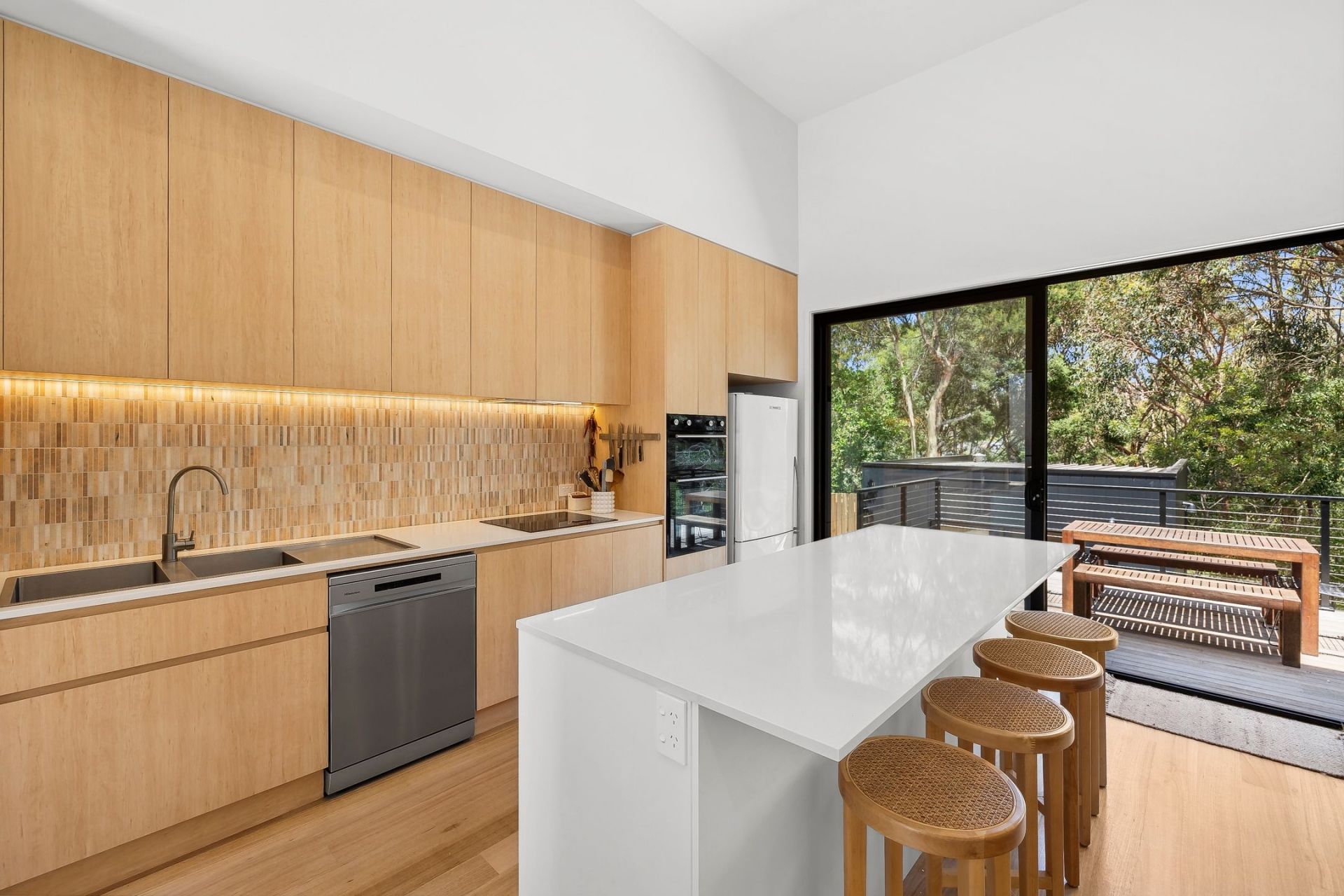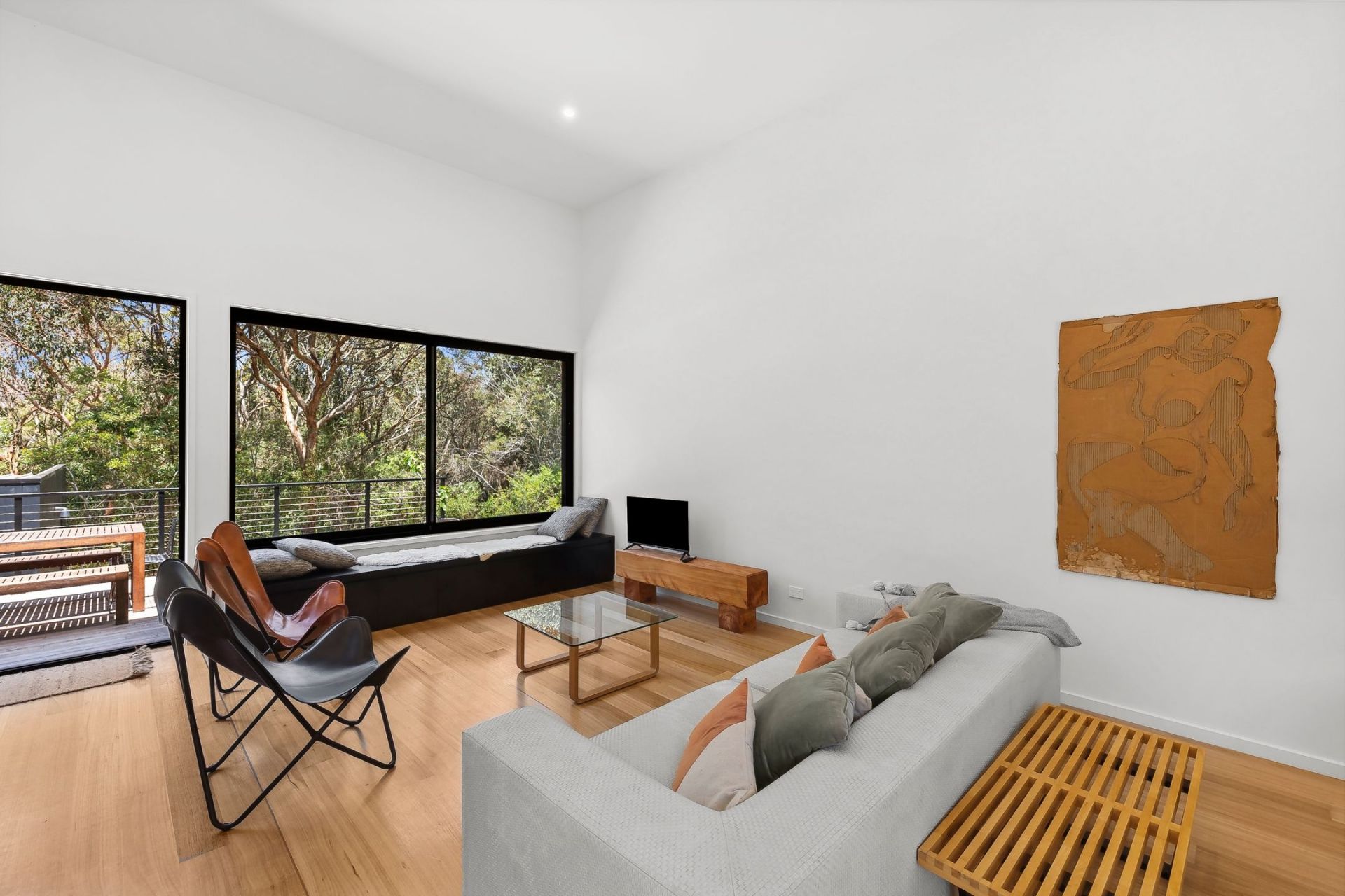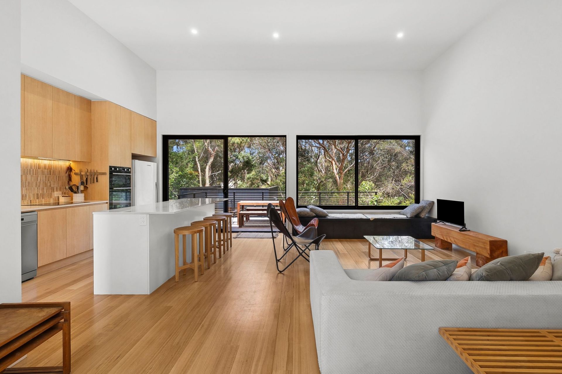 • The light-filled open-plan living area, featuring soaring ceilings, stylish interiors & large windows framing breathtaking green views, opening onto a private deck.