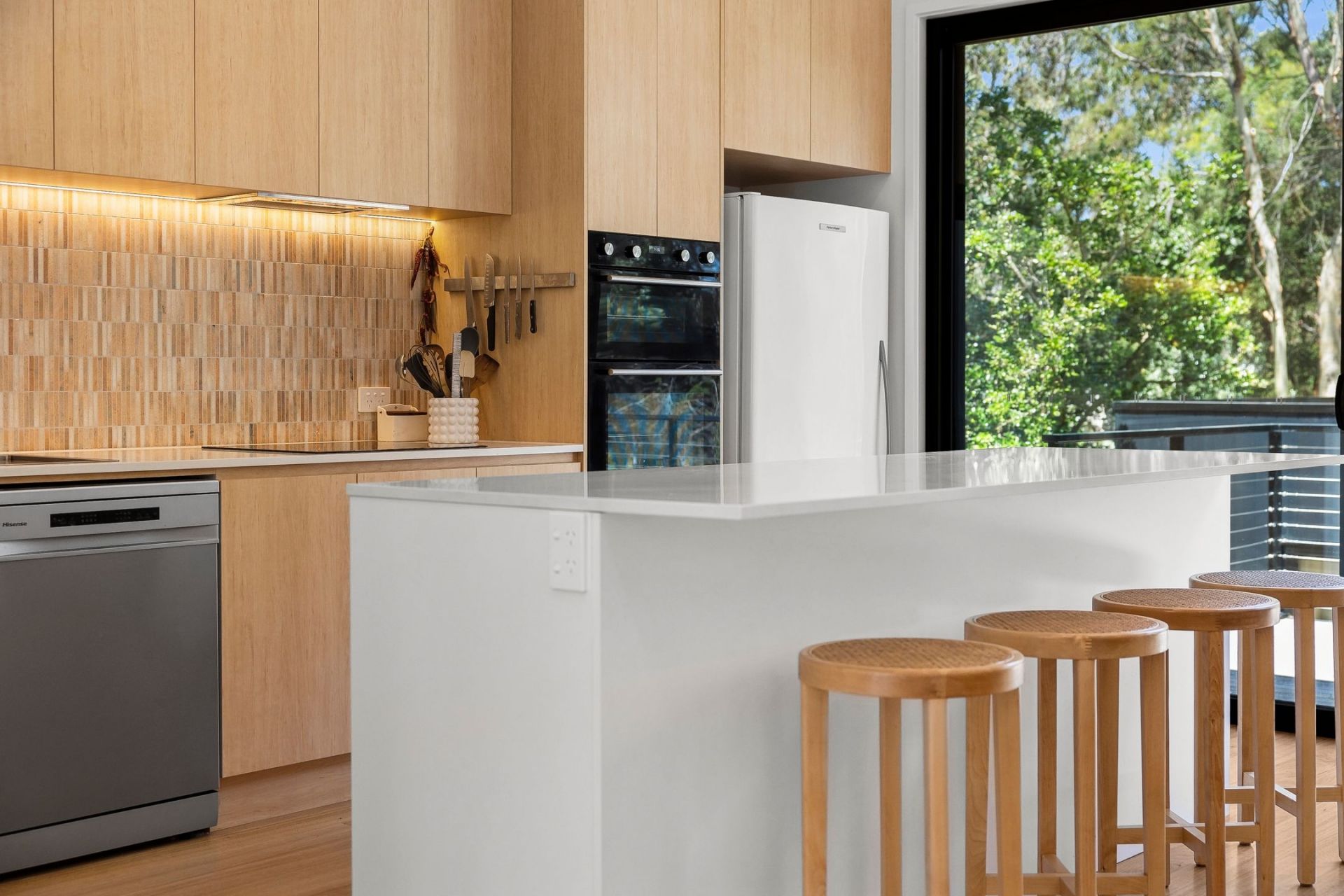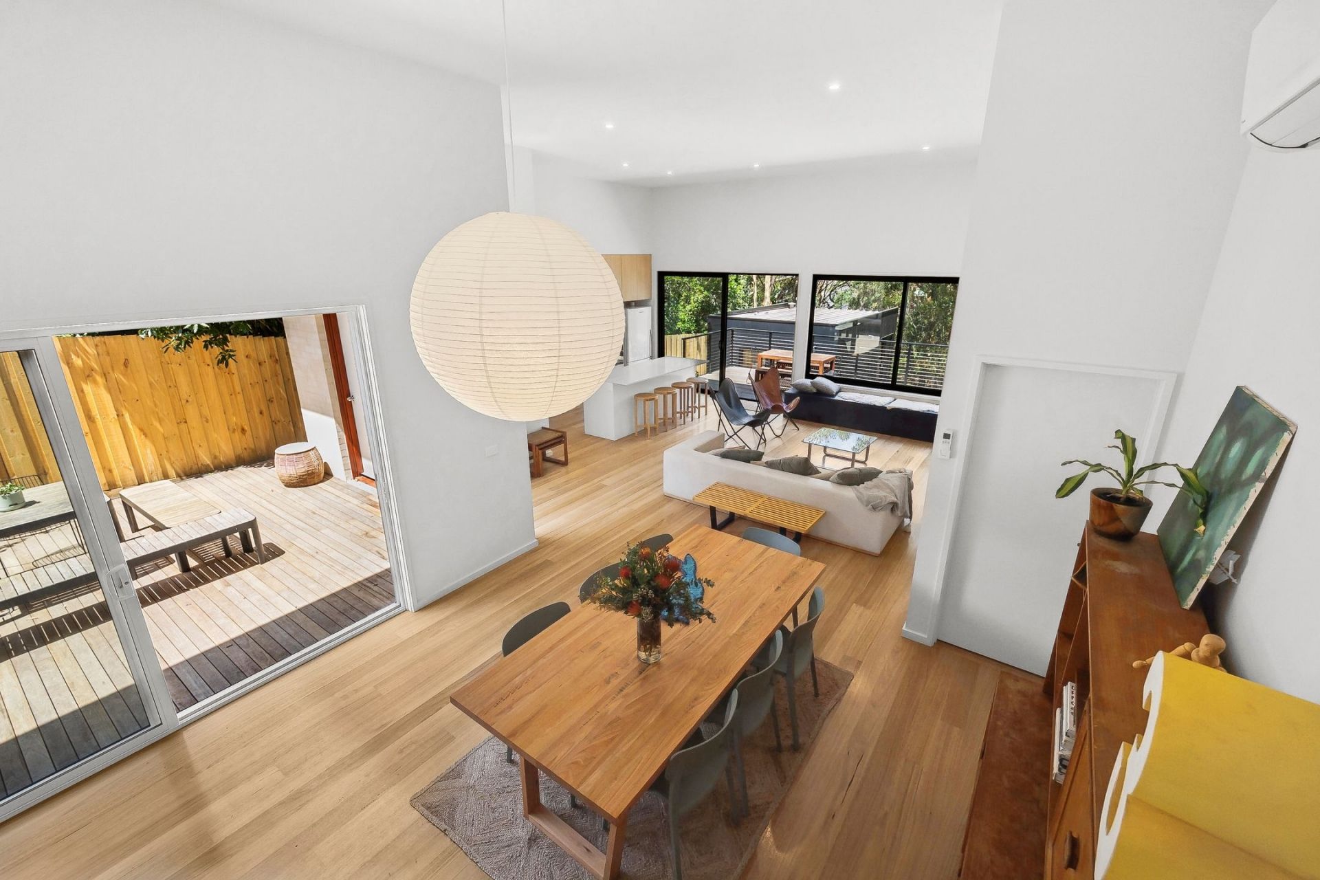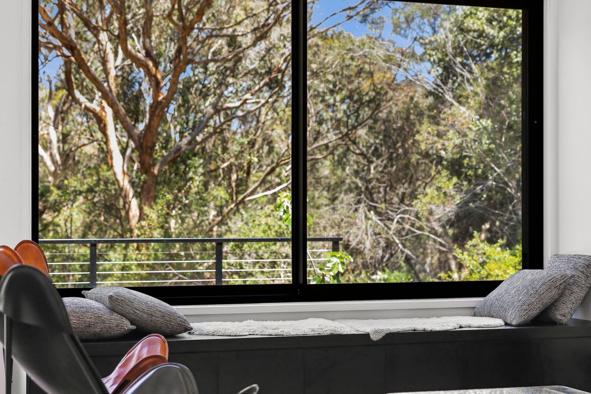 • The light-filled open-plan living area, featuring soaring ceilings, stylish interiors & large windows framing breathtaking green views, opening onto a private deck.