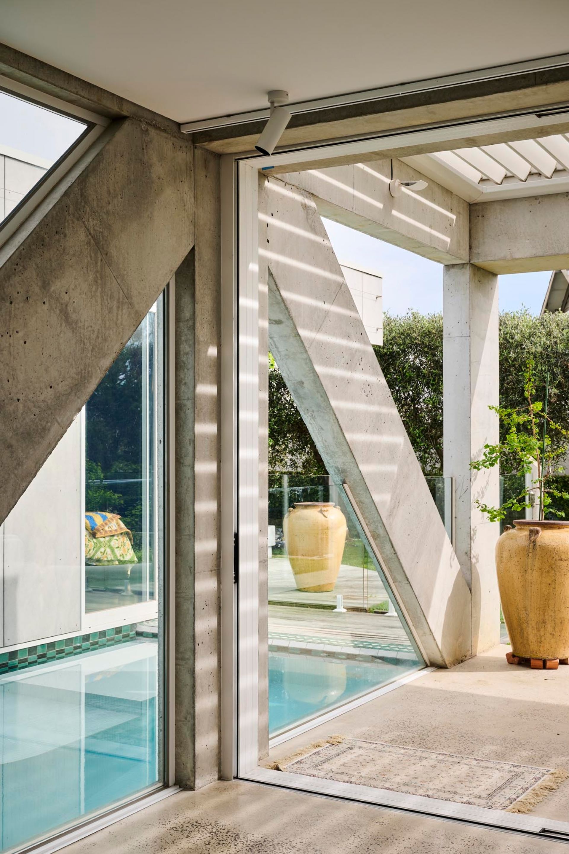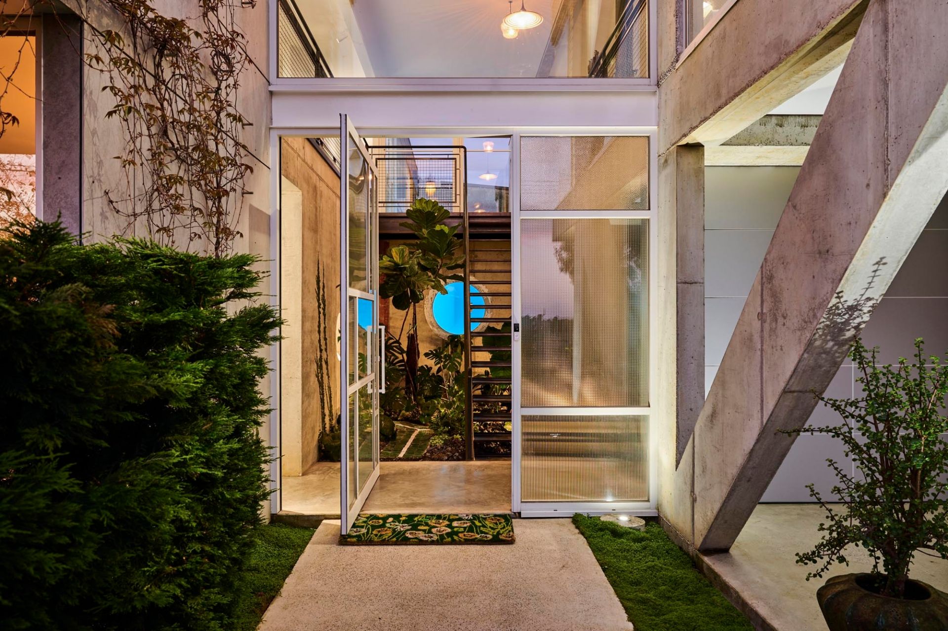• A striking garden frontage illuminated by night, leading to a dramatic mixed-glass pivot door that reveals an indoor garden & circular window glimpsing the pool.