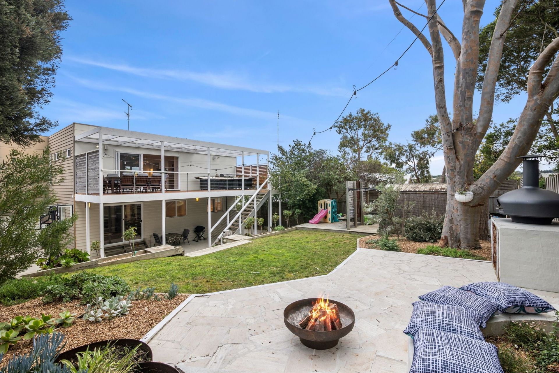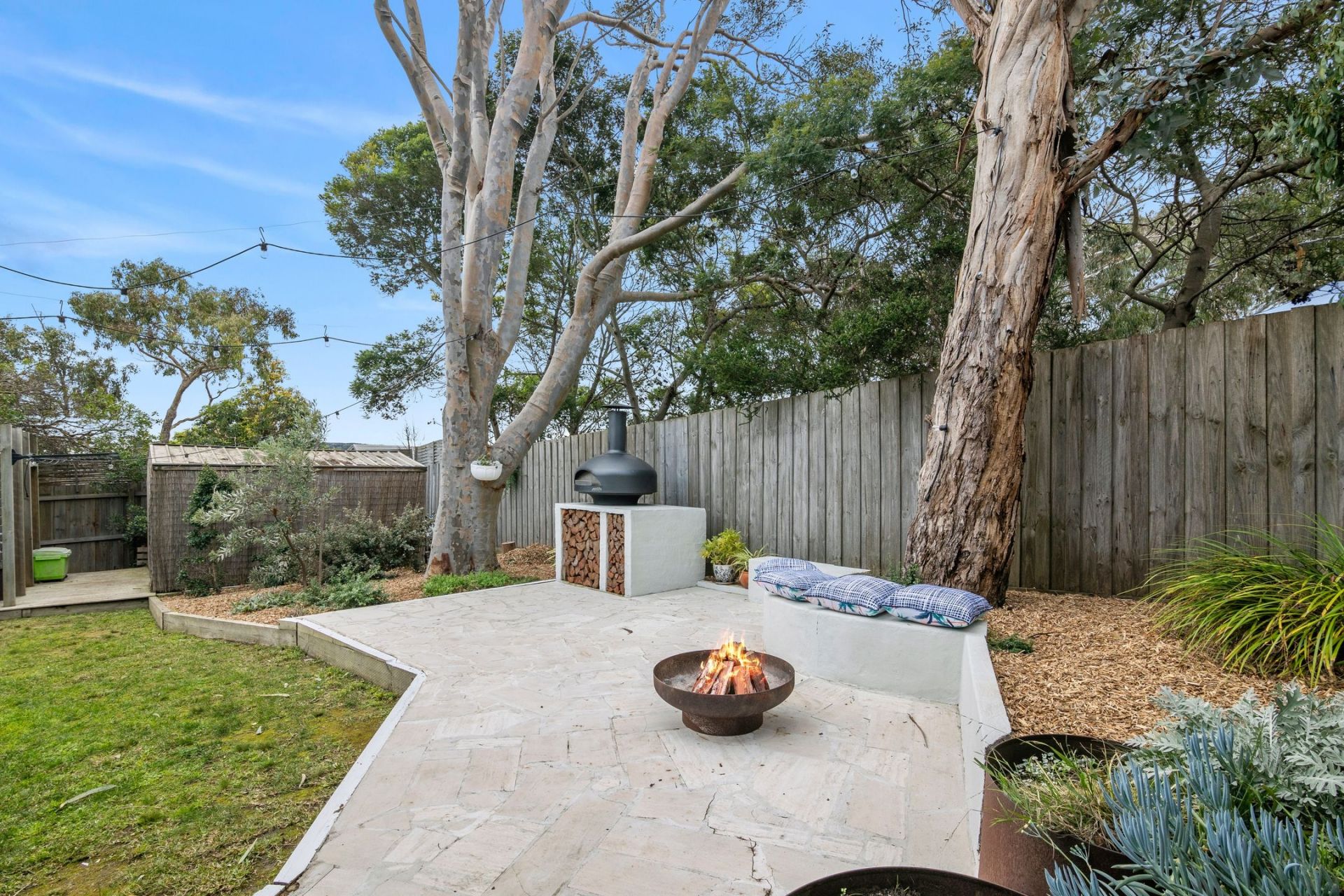 • Enjoying the expansive yet private backyard for entertaining, boasting a pizza oven, firepit, towering trees & an outdoor shower for rinsing off sand from the beach.