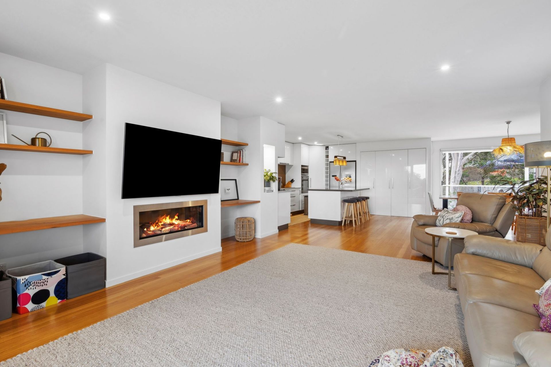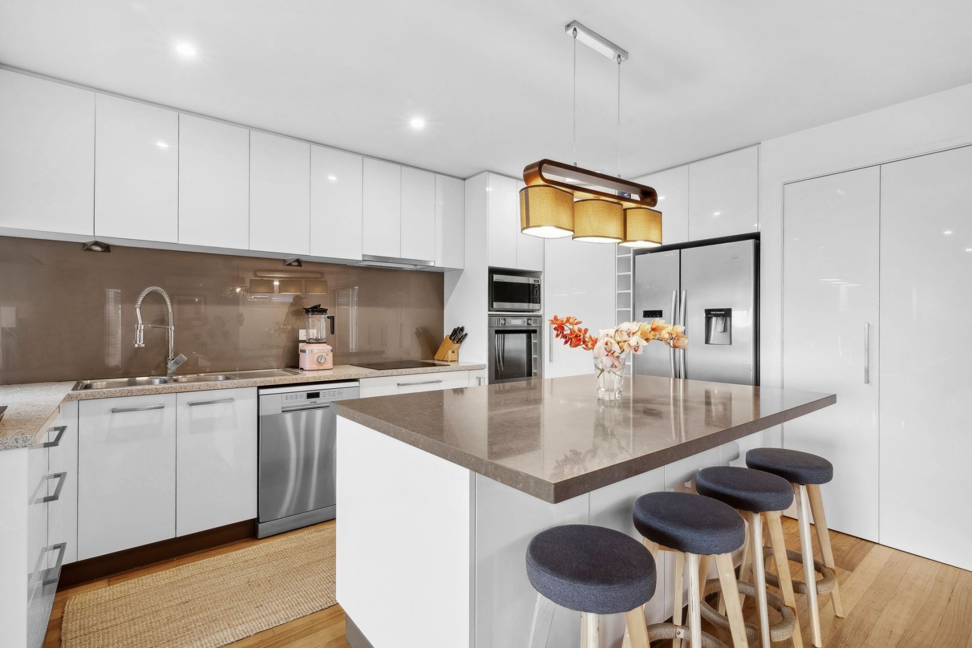 • Quality features including an ambient gas log fire, stylish Tasmanian Oak flooring, chic plantation shutters & a superb kitchen with induction cooking & an elegant stone-top island bench.