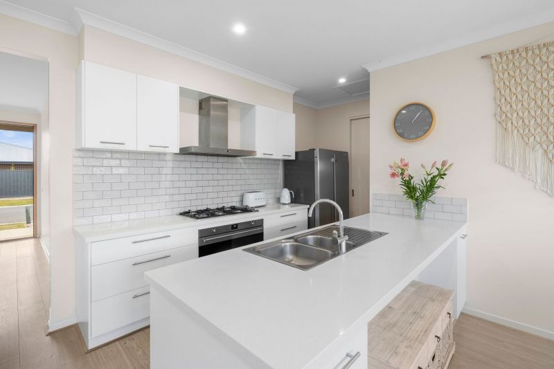 • The sleek kitchen is enhanced by stone benchtops, a breakfast bar for meals on the go, a walk-in pantry, tile splashback & a 900mm oven with gas cooktop.
