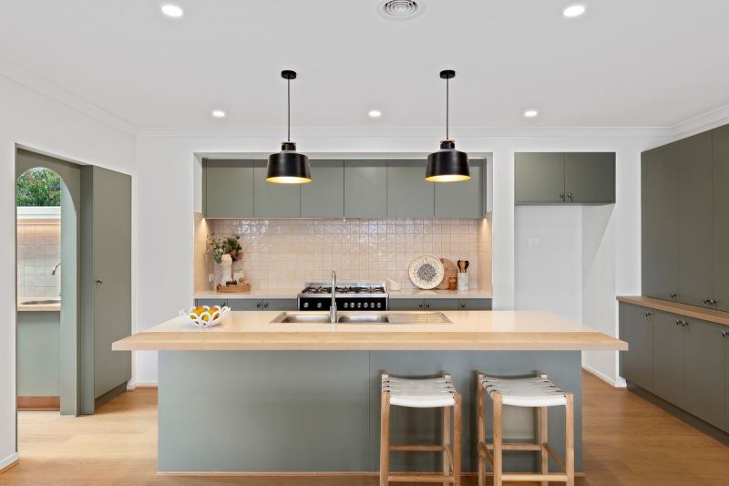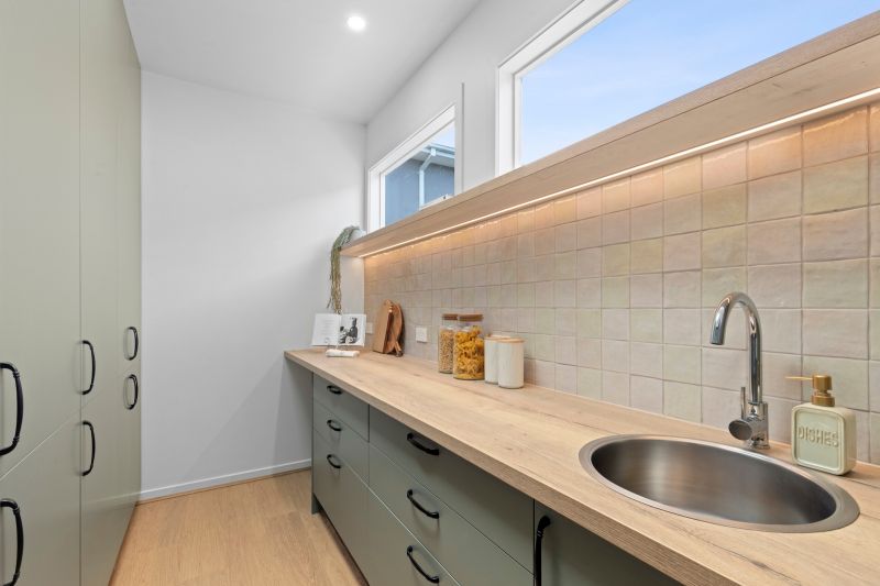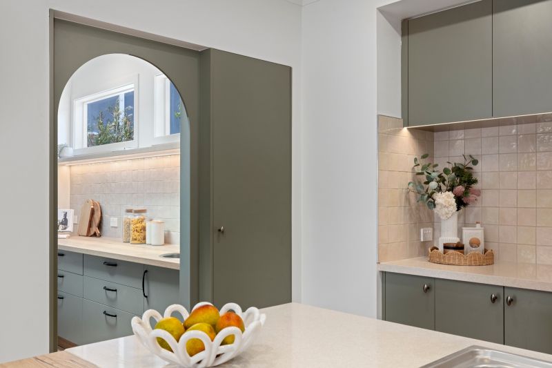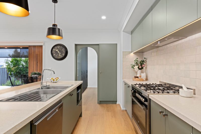 • Cooking in the showpiece kitchen, boasting stylish cabinetry & stone benchtops, quality appliances, tile splashback & a butler’s pantry behind an arched doorway.