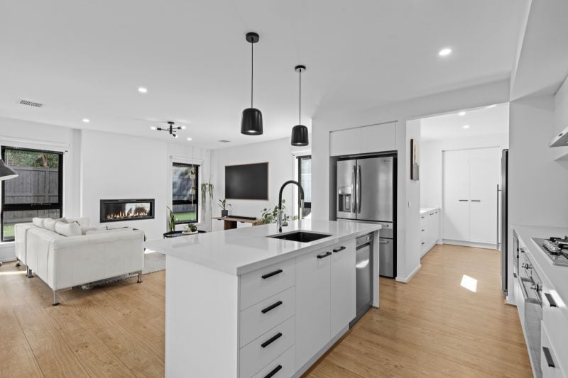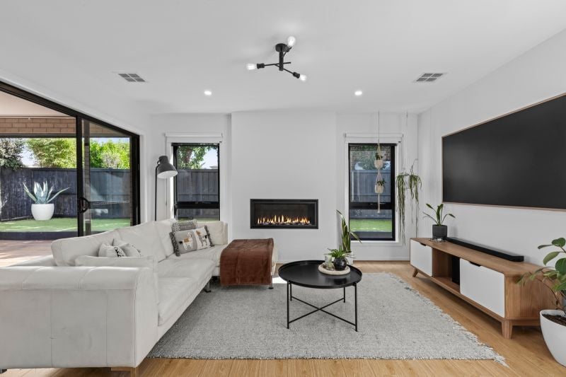 • Hosting across the expansive open plan living zone, where a feature gas fireplace anchors the space & sliding doors connect to a covered alfresco with pull-down blinds for sheltered outdoor living.