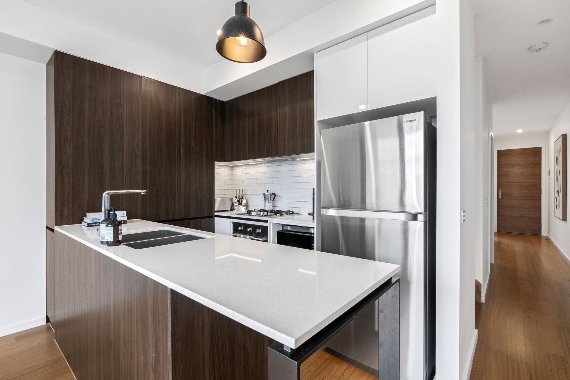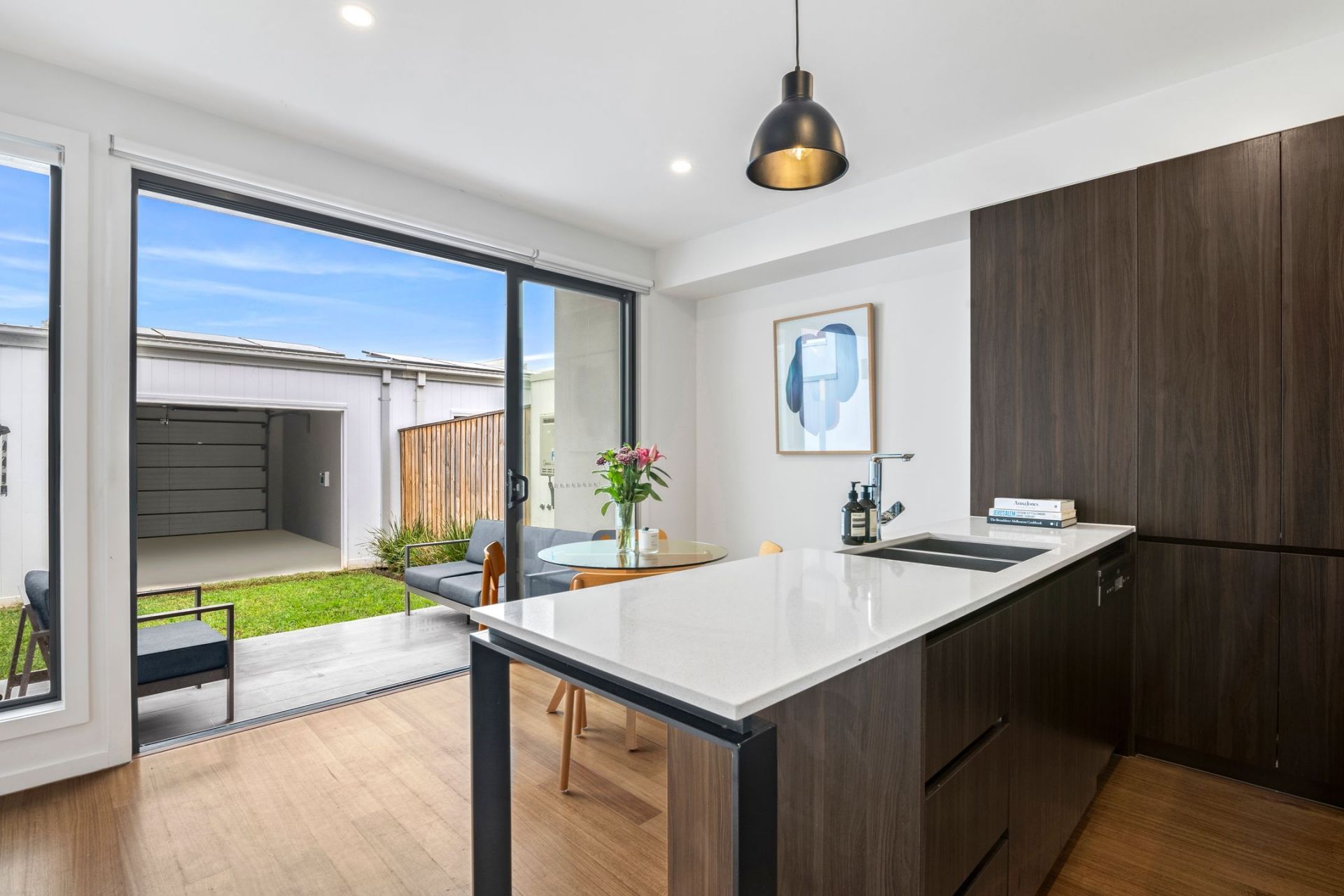 • The sleek contemporary kitchen/dining area, featuring quality appliances, an integrated dishwasher, stone benchtops, a built-in pantry & breakfast bar, all seamlessly extending to a serene courtyard with a built-in BBQ.
