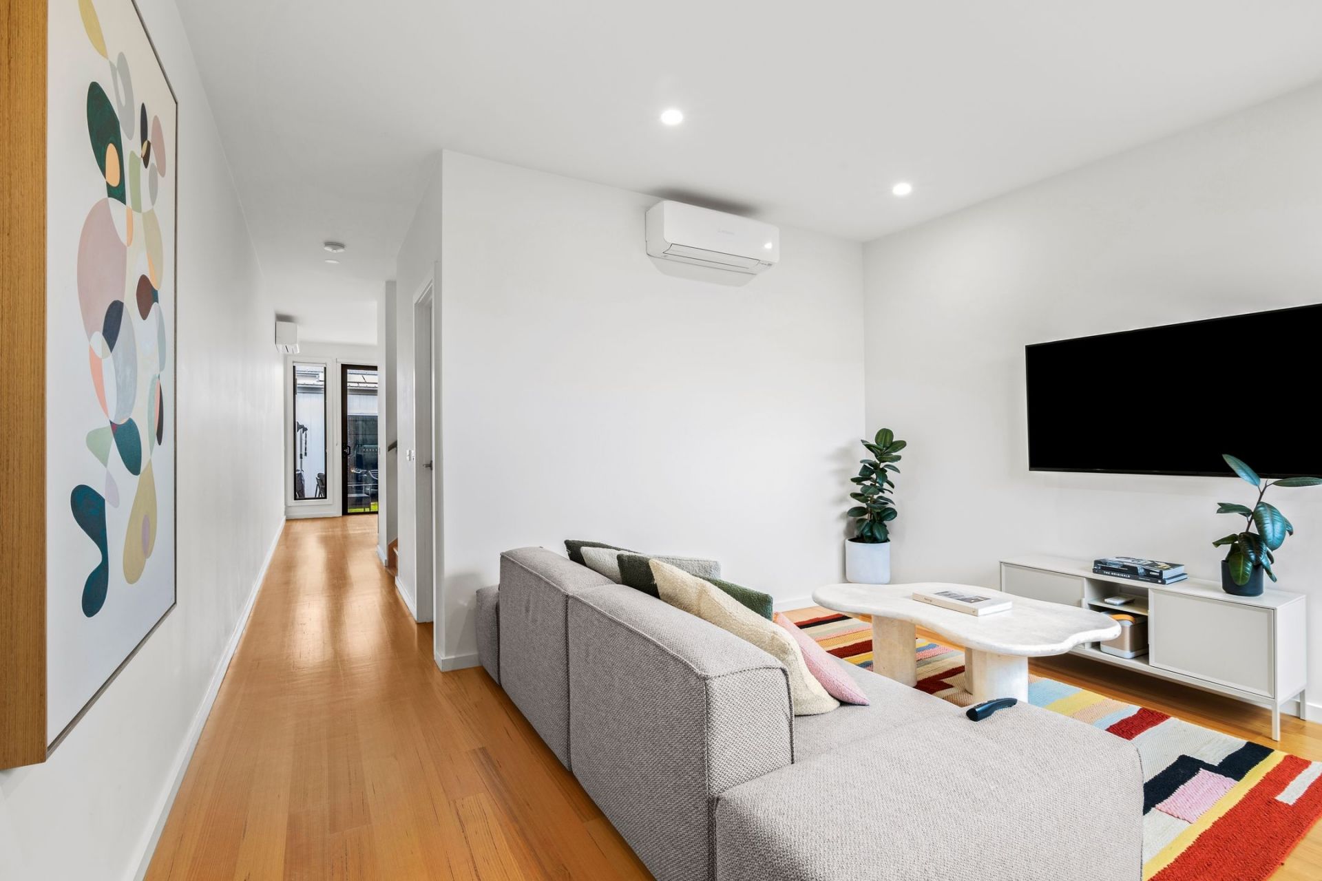 • Premium finishes throughout, including stone benchtops, high ceilings, beautiful hardwood floors, multiple split systems & a timber staircase with skylight.