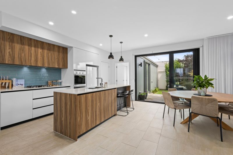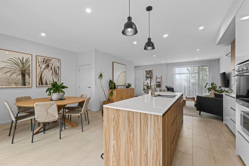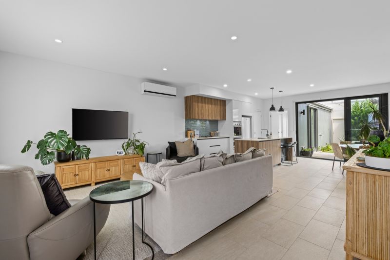 • The light-filled ground floor living zone, where sunshine pours in & the outlook extends beyond the front garden, connecting daily life to the outdoors & an active coastal community.