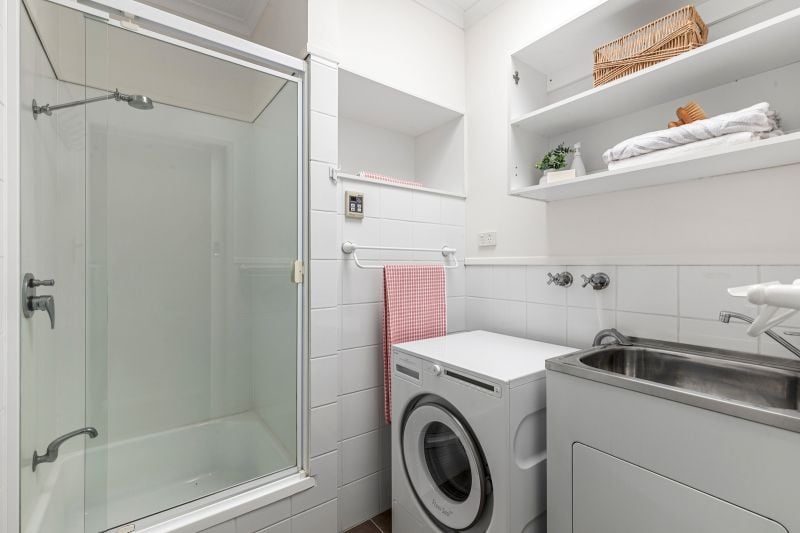 • The bathroom doubles as a combined laundry, with shower, trough & heat lamp, plus a separate toilet & vanity for convenience.