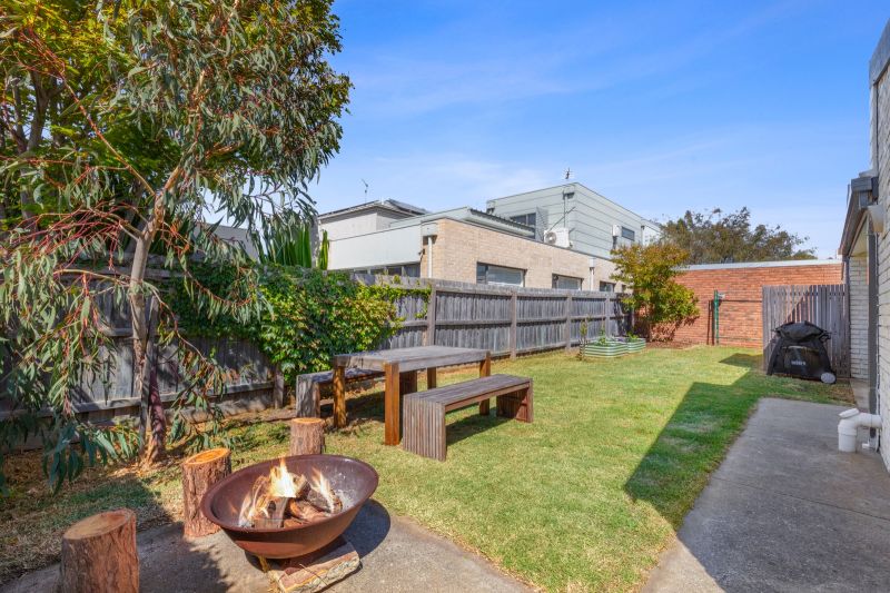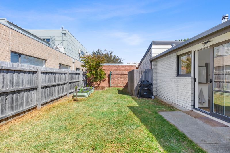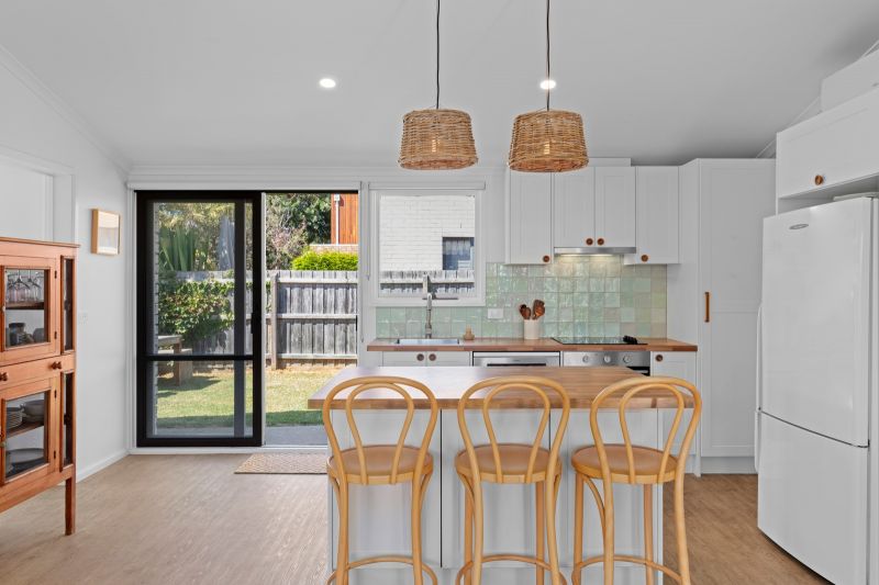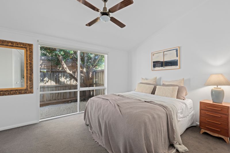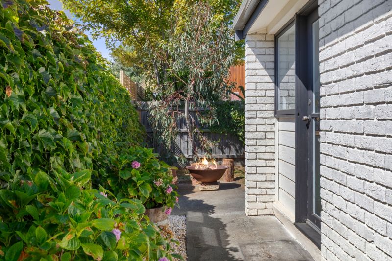 • This light-filled and welcoming two-bedroom unit, one of only two on separate titles (shared driveway), privately tucked away at the rear of the block and enhanced by soaring vaulted ceilings and freshly painted interiors.