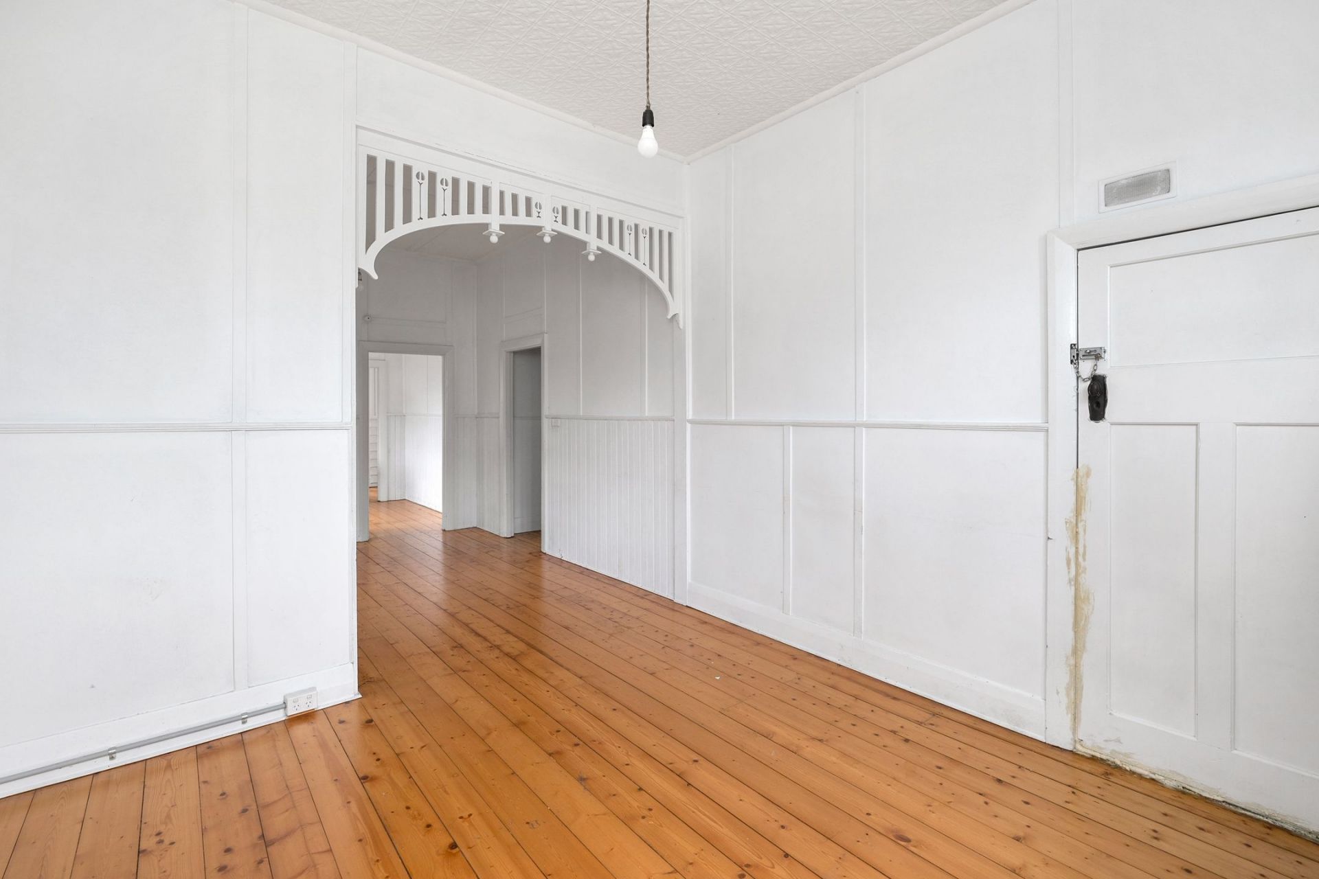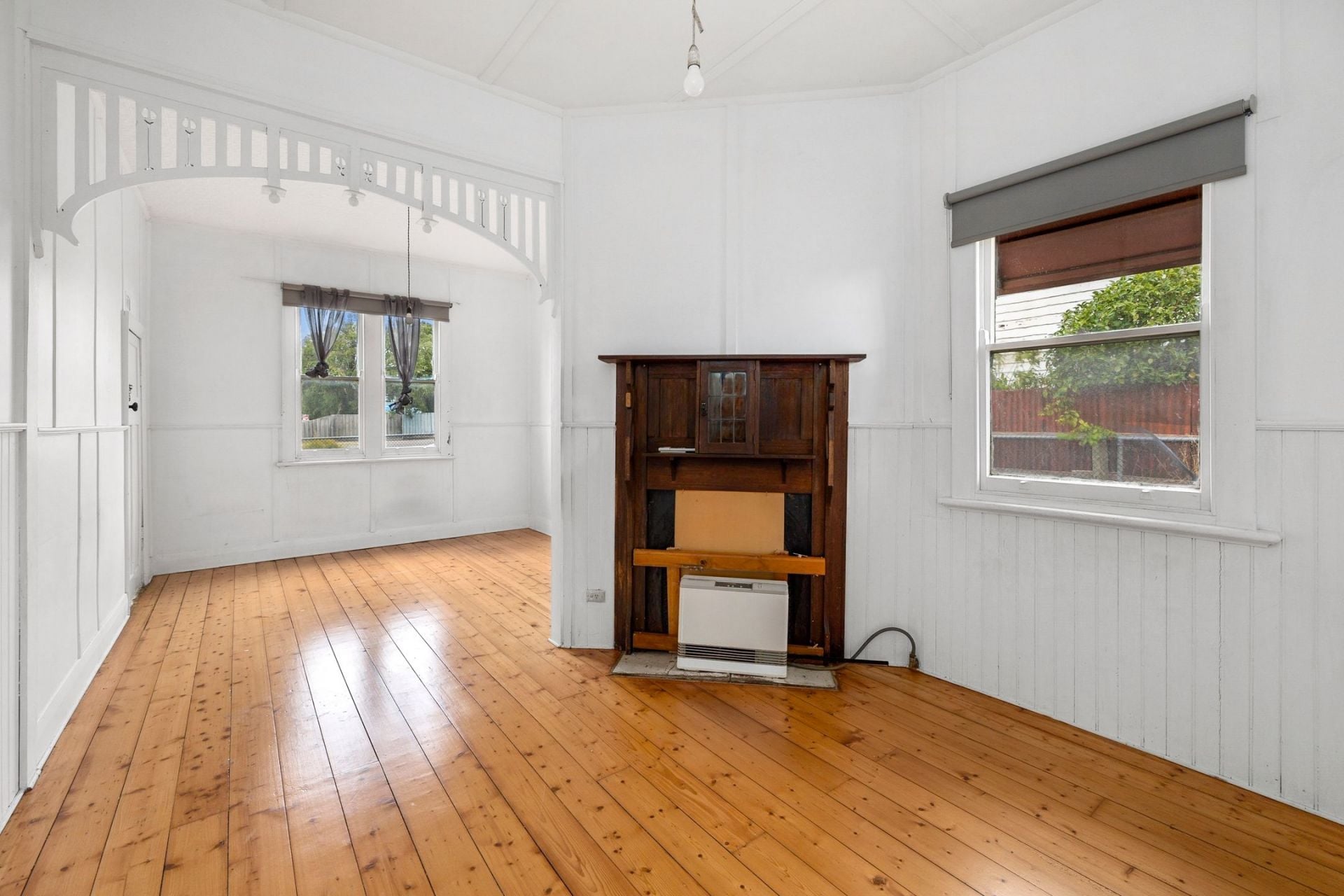 • The warm & welcoming lounge/dining space, featuring high ceilings with original detailing, rich Baltic pine floors & a beautiful ornate fireplace.
